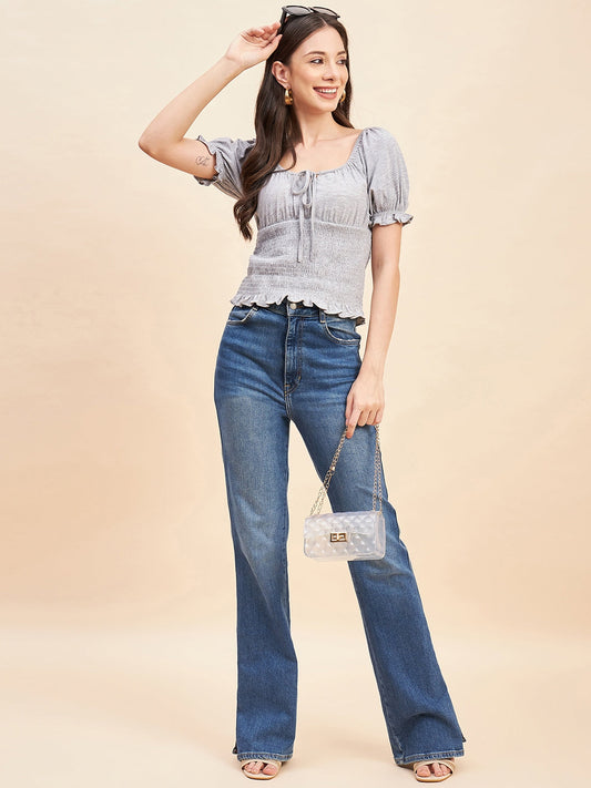Sweet heart neck and side seam gathers at waist.