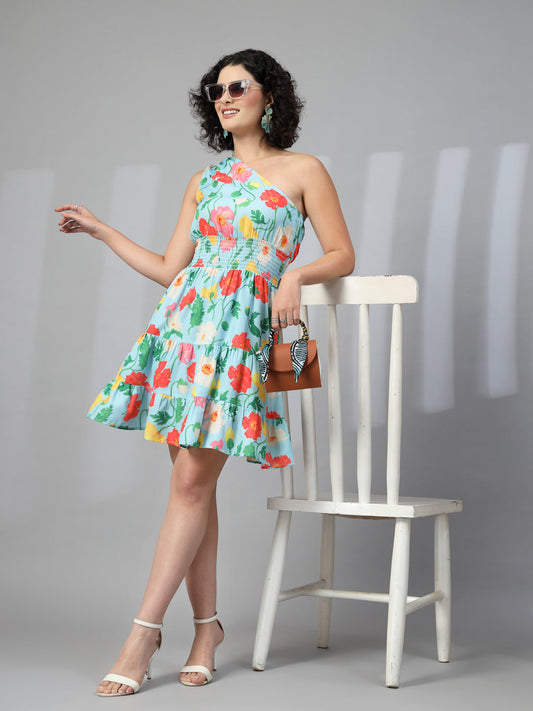 Turquoise Blue Big Floral One Shoulder Dress